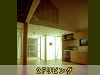 ・2階リビング。階段の明かりが灯篭のように見えます。