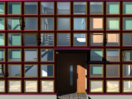 杉板目透かし張りの強調された重厚な扉が組み込まれた玄関ドアで す
